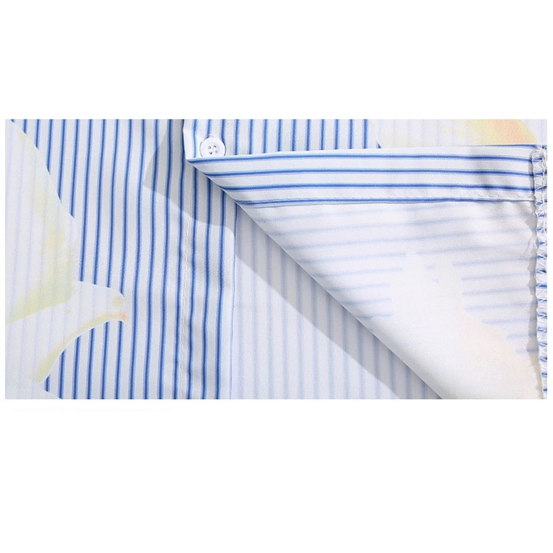 Bring calm and creativity to your look with this short sleeve striped shirt featuring a soft bird silhouette print. The crisp blue-and-white vertical stripes contrast subtly with the artistic bird design, giving off a serene, modern vibe. Made from lightweight fabric with a relaxed fit – perfect for summer days, festivals, or laid-back city style.